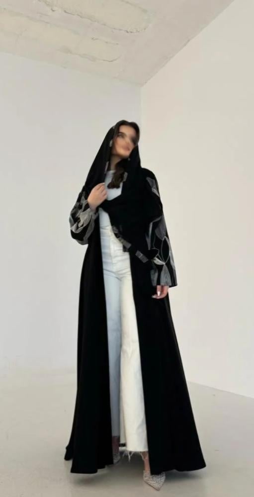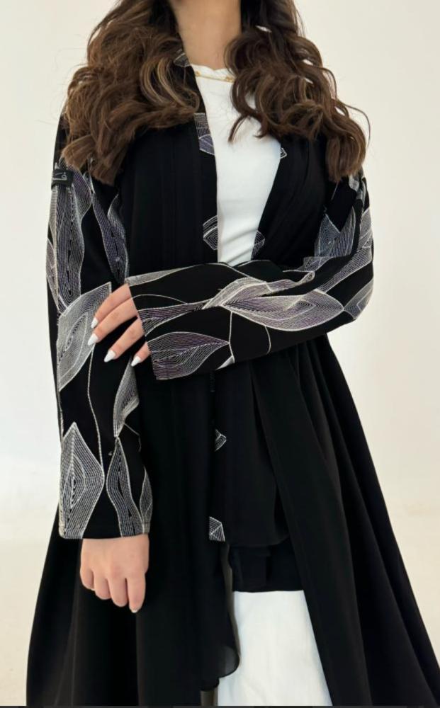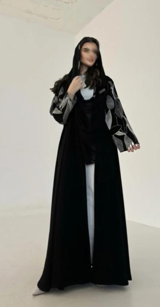 عباية مع اكمام مطرزة قصة كلوش بتفاصيل دقيقة تمنحك إطلالة تجمع بين الفخامة والراحة مثالية للمناسبات الرسمية أو المشاوير اليومية لتظهري بأبهى حلة دائماً.