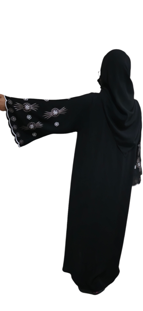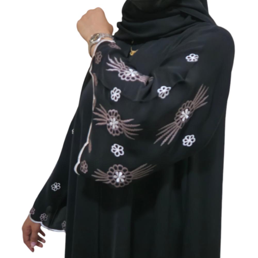- عباية تطريز ورد فاخر على الأكمام تضفي على إطلالتك لمسة فنية تجمع بين الرقي والأصالة.