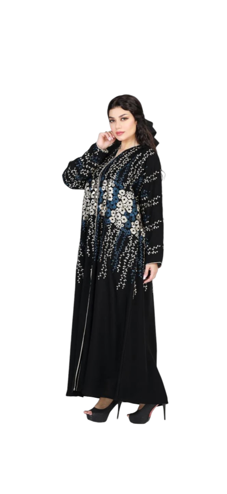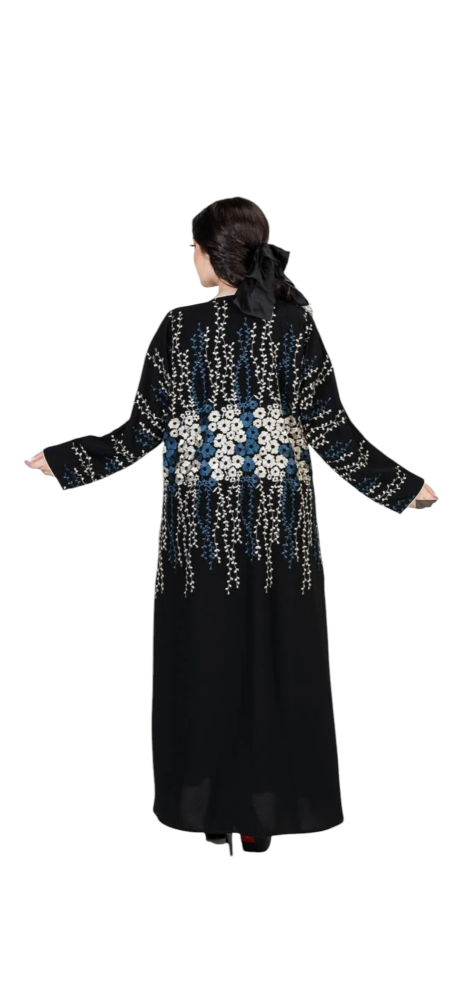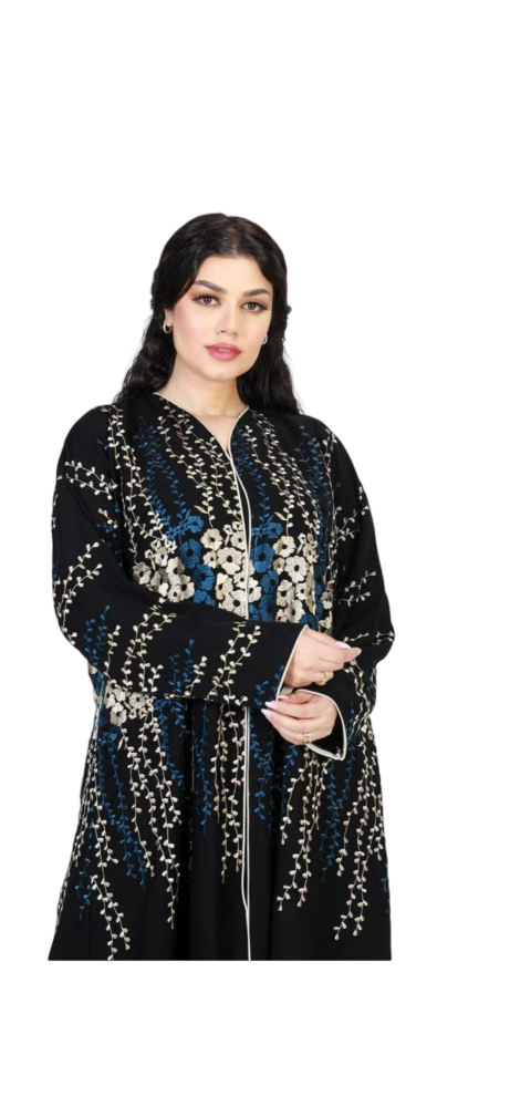 - التطريز: تطريز فاخر بألوان الأبيض والكحلي يزين العباية بالكامل.